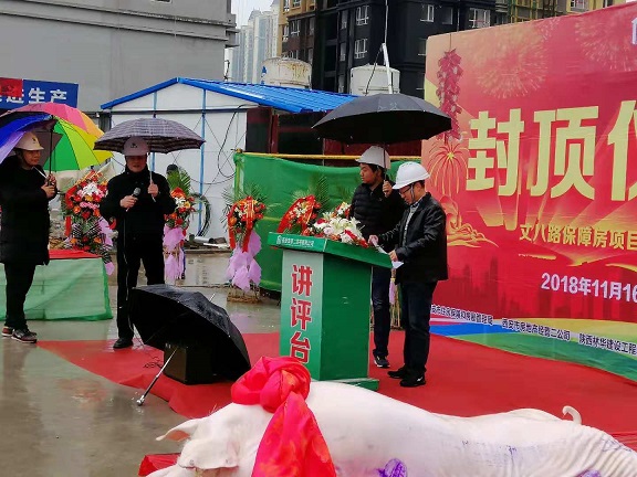 11月16日星期五丈八路保障房項目的施工現(xiàn)場,禮炮在片片雨云中炸響,鞭炮粘著雨花淅淅的散落著,雖然下著小雨,但是現(xiàn)場依舊人山人海,熱鬧非凡;10點50分隨著項目指揮長邢京平同志的聲音響起,丈八路項目封頂儀式正式開始。丈八路保障房項目4號樓主體順利封頂,標志著丈八路項目再一次完成了重要節(jié)點性的施工任務,這是所有現(xiàn)場施工人員堅持不懈的努力下共同完成的勞動成果;開發(fā)單位西安市經(jīng)營二公司書記王備戰(zhàn)同志在講話中對現(xiàn)場施工人員的工作予以高度肯定,并再三叮囑大家要再接再厲完成好后續(xù)工作,參加本次活動的還有建設單位各級領導,監(jiān)理單位總監(jiān)及各專業(yè)工程師,施工單位西安市第二住宅建筑公司副經(jīng)理杜軍、技術(shù)總工劉琪、指揮長邢京平、現(xiàn)場負責人陳衛(wèi)民及各級現(xiàn)場施工人員。