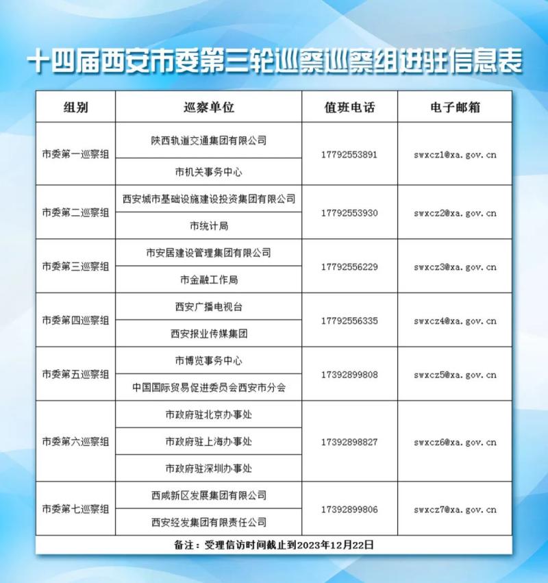 經(jīng)市委批準(zhǔn),十四屆市委第三輪巡察共成立7個巡察組,分別對陜西軌道交通集團(tuán)有限公司、市統(tǒng)計(jì)局、市金融工作局、市機(jī)關(guān)事務(wù)中心、市博覽事務(wù)中心、西安報(bào)業(yè)傳媒集團(tuán)、西安廣播電視臺、中國國際貿(mào)易促進(jìn)委員會西安市分會、西安城市基礎(chǔ)設(shè)施建設(shè)投資集團(tuán)有限公司、市安居建設(shè)管理集團(tuán)有限公司、市政府駐北京辦事處、市政府駐上海辦事處、市政府駐深圳辦事處等13家單位開展常規(guī)巡察,對西咸新區(qū)發(fā)展集團(tuán)有限公司、西安經(jīng)發(fā)集團(tuán)有限責(zé)任公司2家單位開展提級巡察。